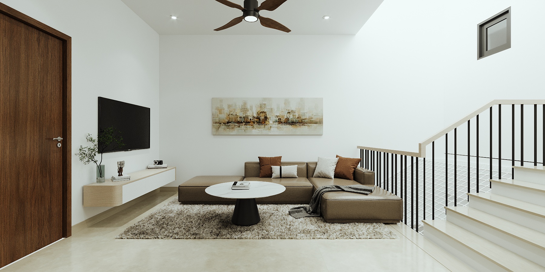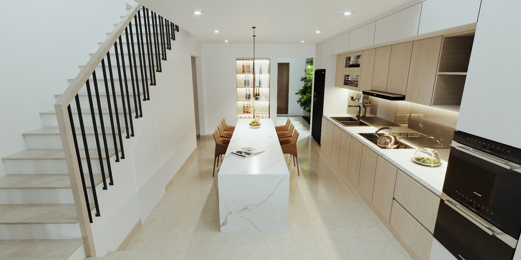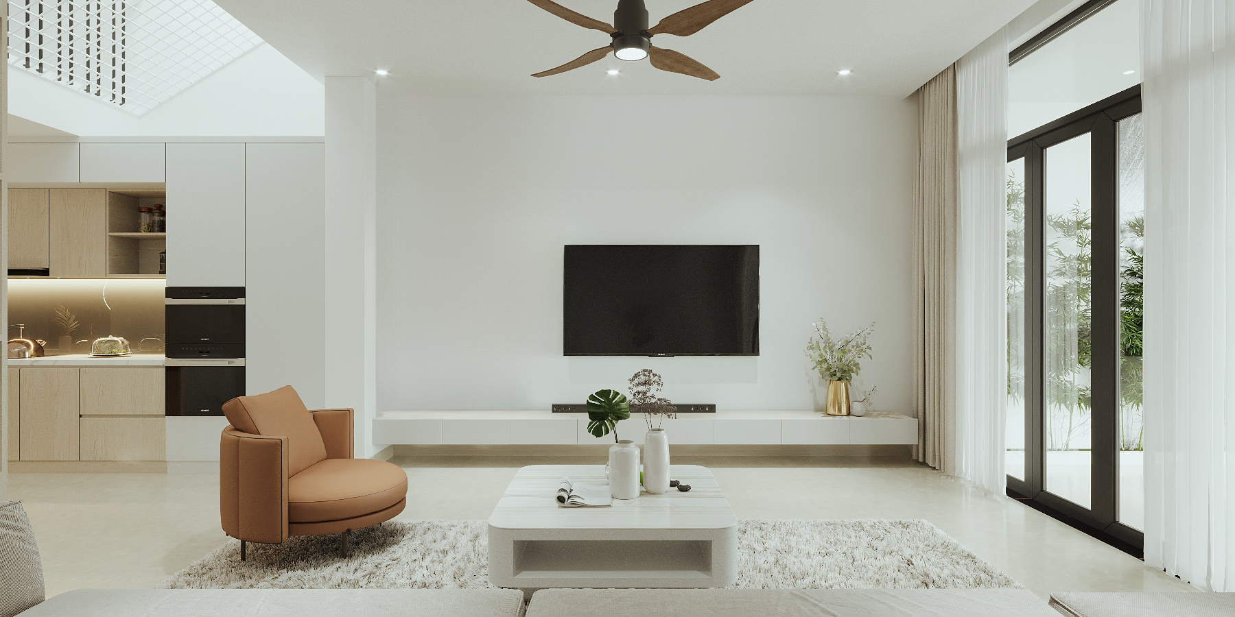 Khoác lên mình gam màu trắng chủ đạo, ngôi nhà như mở ra một không gian sống thoáng đãng, tinh khôi và đầy ánh sáng. Điểm xuyết là những chi tiết gỗ ấm áp, vừa mang hơi thở hiện đại vừa giữ được nét gần gũi, thân thiện.