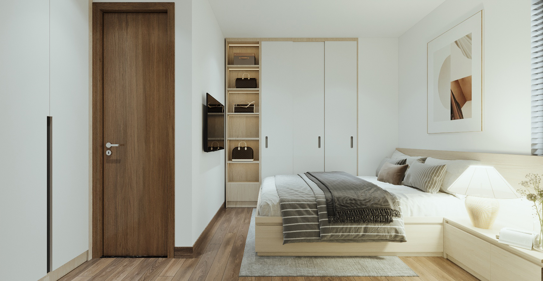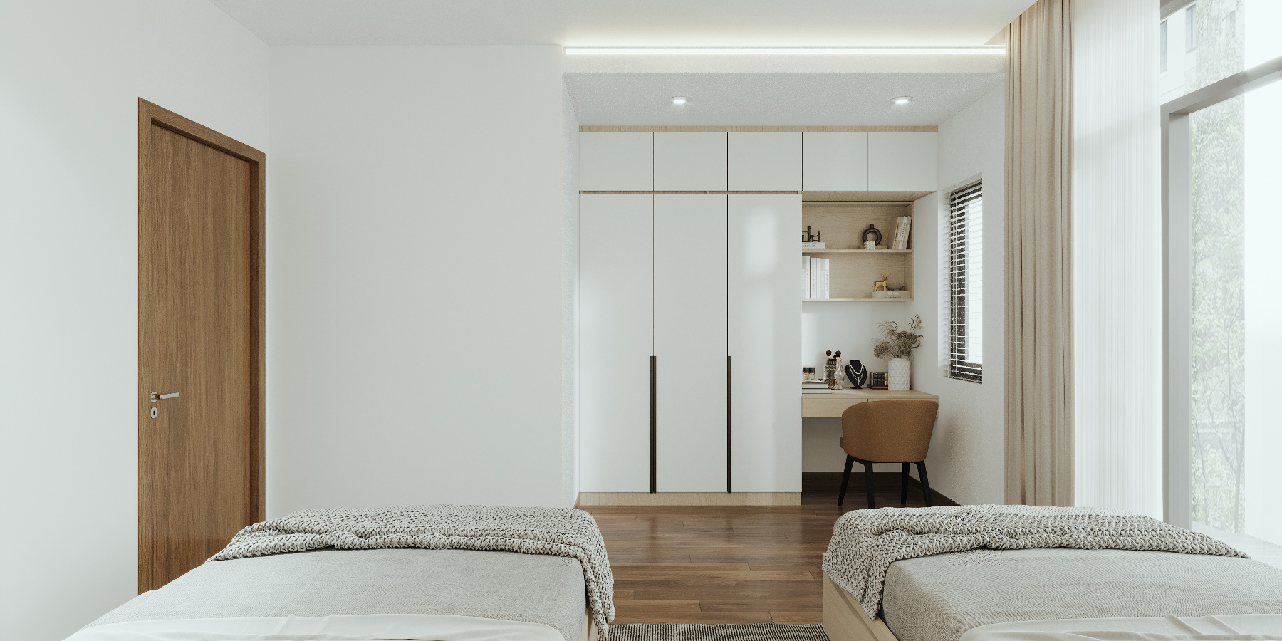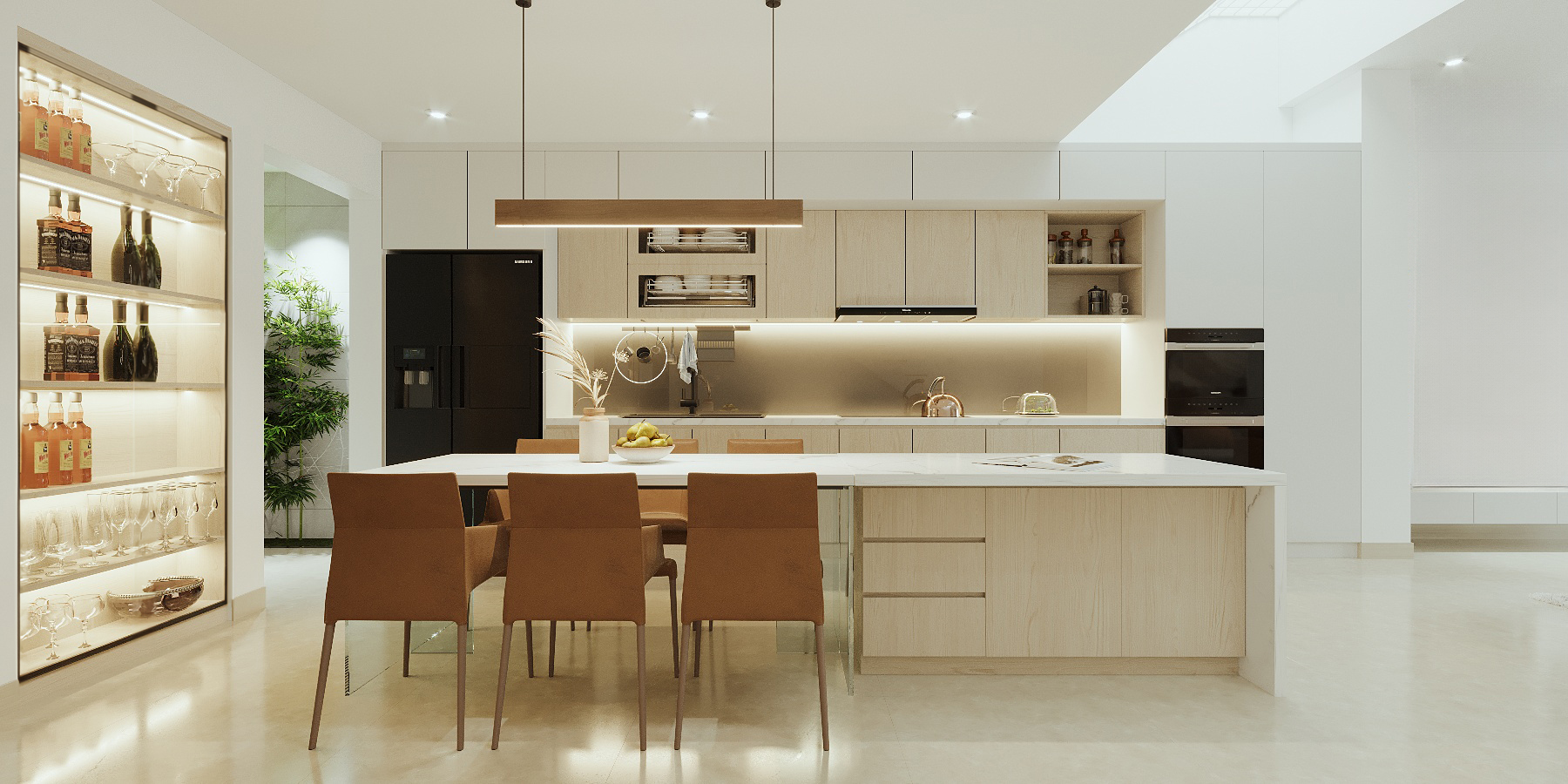 Khoác lên mình gam màu trắng chủ đạo, ngôi nhà như mở ra một không gian sống thoáng đãng, tinh khôi và đầy ánh sáng. Điểm xuyết là những chi tiết gỗ ấm áp, vừa mang hơi thở hiện đại vừa giữ được nét gần gũi, thân thiện.